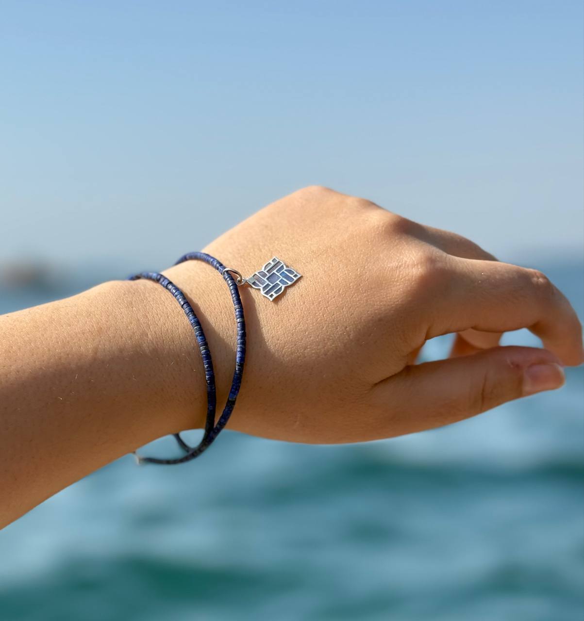 پلاک نقره با آبکاری طلا سفید و میناکاری و رشته سنگ لاجورد افغان