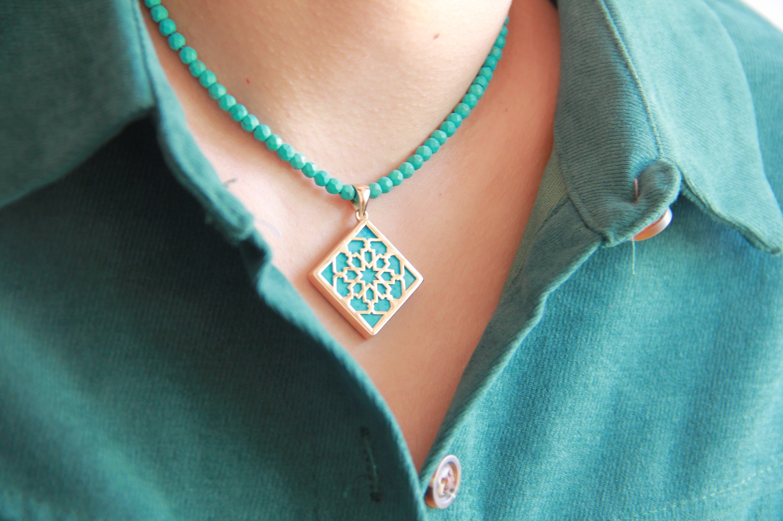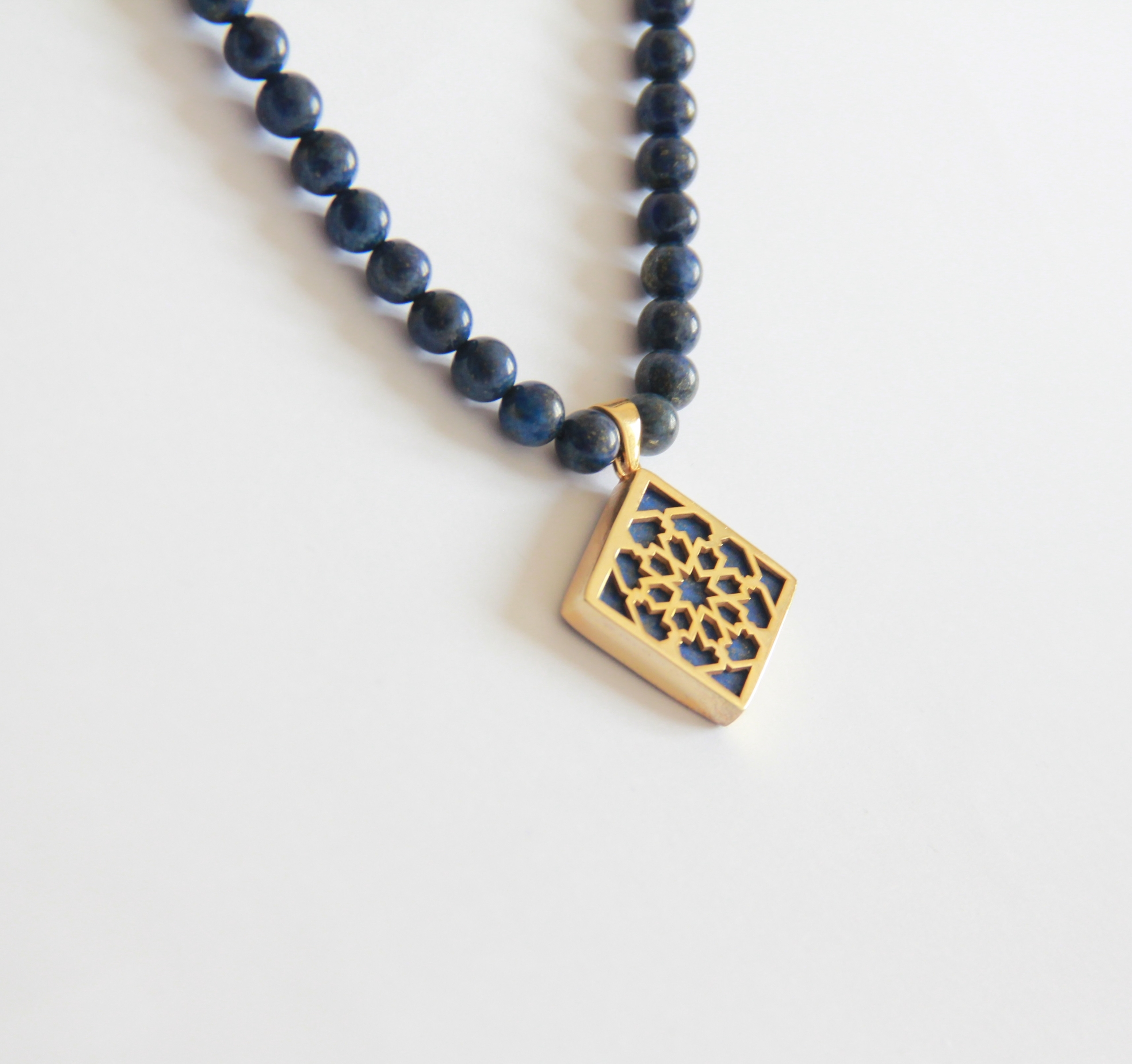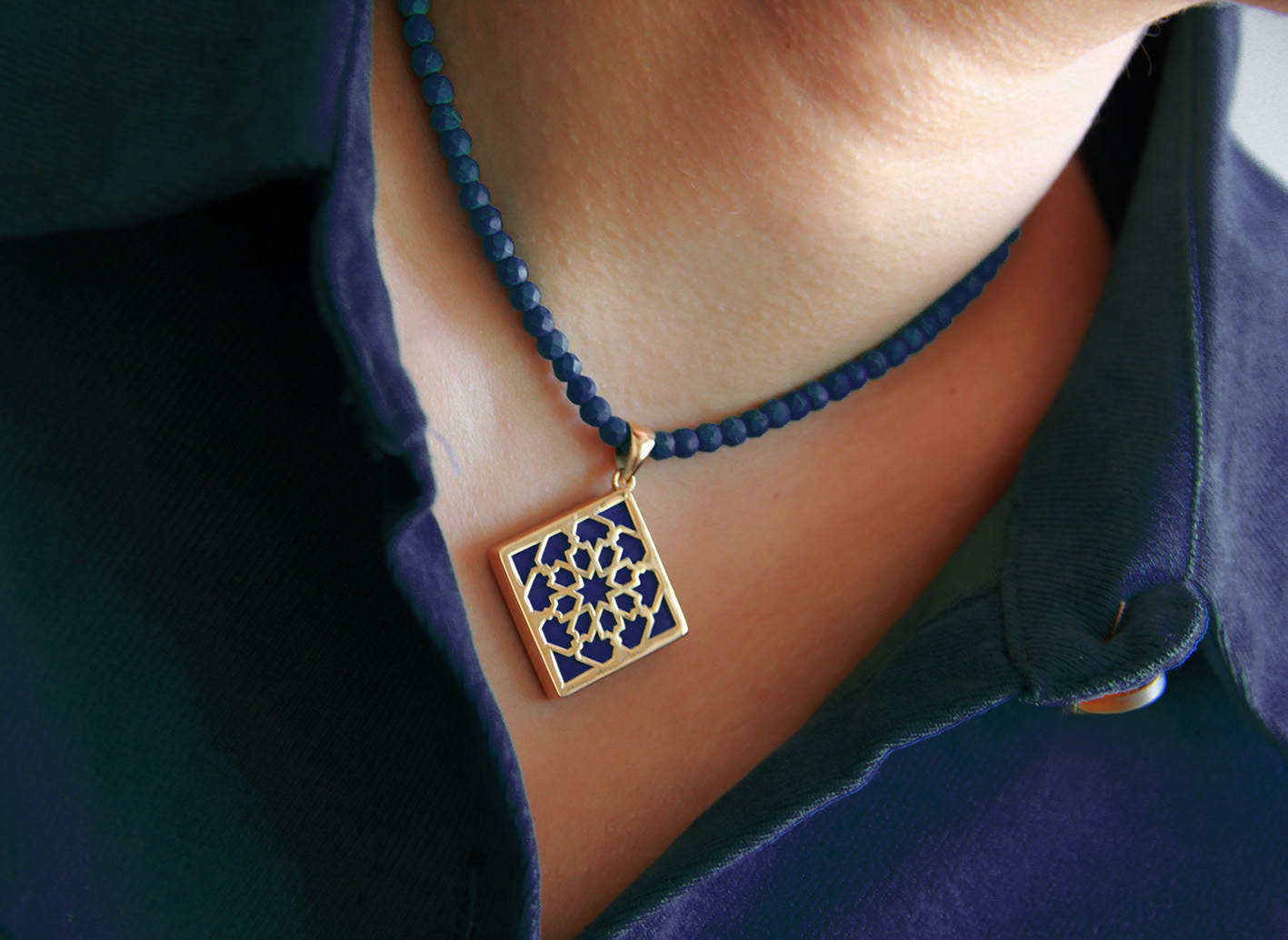 توضیحات: آویز مدل ارسی منقش به گره های چینی که در پنجره های ارسی دوره ای از معماری بناهای ایران بکارمی رفته است . در اثر فوق ، پلاک ارسی نماد پنجره ای رو به آسمان آبی ست.